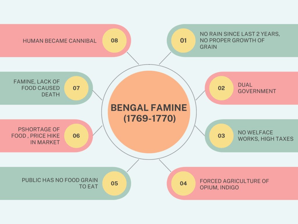 1769 – There was very less rainfall and chickenpox epidemic had spread in Bengal so crop was not grown in that good amount , Britishers purchased rice in big amount for their soldiers, price has rise twice than normal.
