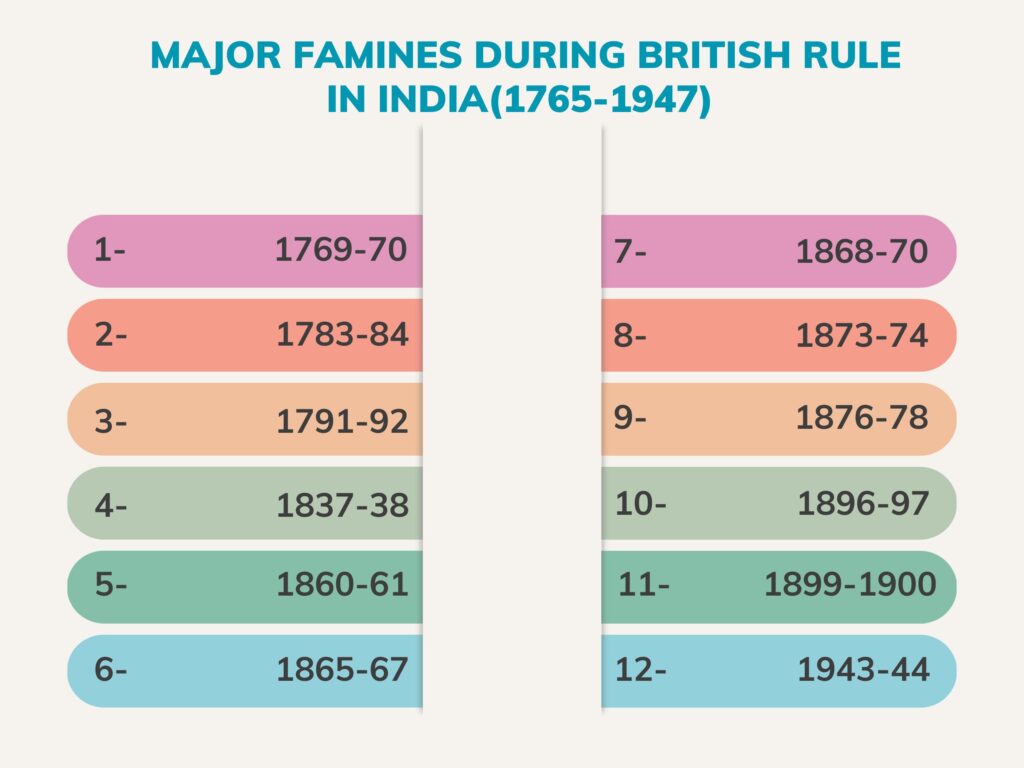 There were many famine between 1764 to 1947 but there were two great famines during this period – Bengal famine of 1770 and the Great Bengal famine of 1943.